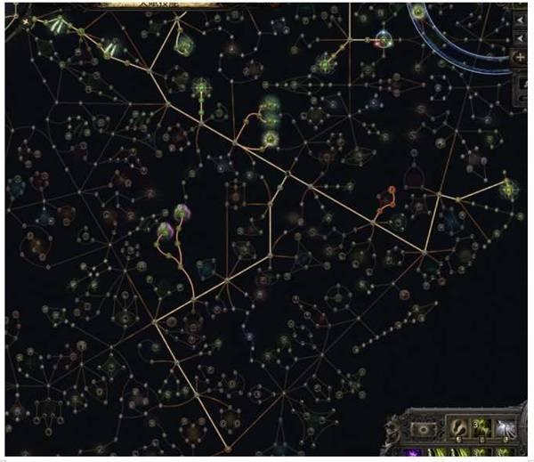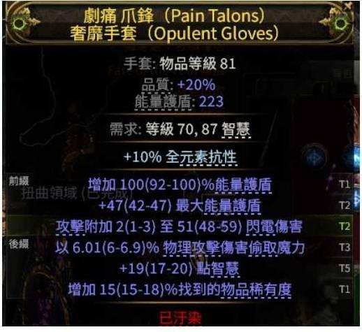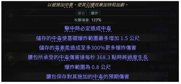 追猎的双倍中毒体系搭配天赋和武器符文可以很轻易做到8层中毒上限。在没有全伤中毒手套的时候只有物理和混沌伤害可以中毒,我们的主要伤害是闪电点伤转化的混沌伤害。因此我们只需要找中毒幅度、中毒层数,中毒持续时间和混沌伤害加成即可。