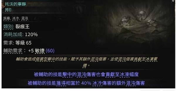 搭配托沃的宁静辅助可以让混沌伤害造成冰冻,瞬间冰冻怪物造成粉碎,触发冰捷,给冰捷连上中毒辅助,配合毒捷扩散达成连锁爆炸一箭清屏。