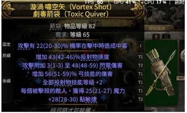 箭袋:攻击中毒基底箭袋,属性要求前缀投射物速度、弓技能伤害、电点伤,T2以上即可,后缀全部投射物技能等级加2,有敏捷和击杀回蓝最好。毒气箭和毒素植载是必定中毒的,但是冰霜射击和冰捷需要中毒几率。