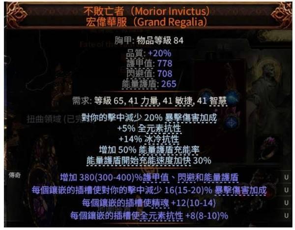 衣服:我选择的是华服来补充抗性和精魂,这赛季华服基础属性加强后不比高精魂的盾闪衣服差。元素抗性和精魂必选,剩下一个属性可以选能力值或者免爆。符文选择缺啥补啥,非常自由。