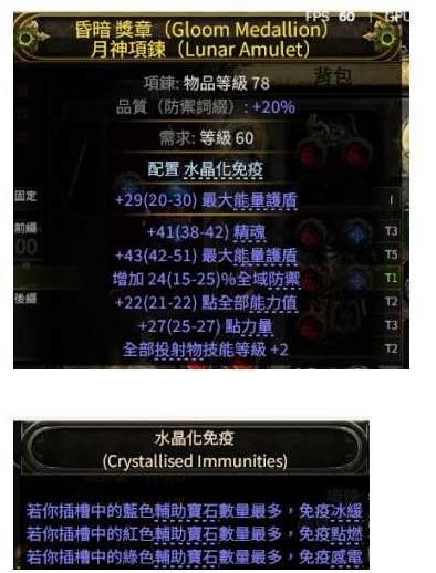 项链:高精魂加投射物等级项链,后缀需要一条全属性,前缀有护盾加成或者百分比护盾最好,空一条用深渊词缀做全局防御。涂油推荐水晶化免疫,搭配插槽内红色辅助最多来免疫点燃。
