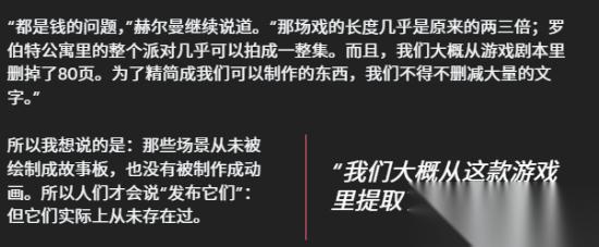 制作人解释称:“真的就只是钱的问题。那一整段内容本来长度是现在的两到三倍……在缩减规模时,我们大概从游戏中砍掉了80页剧本。那是大量不得不被压缩、以符合我们制作能力的内容。”