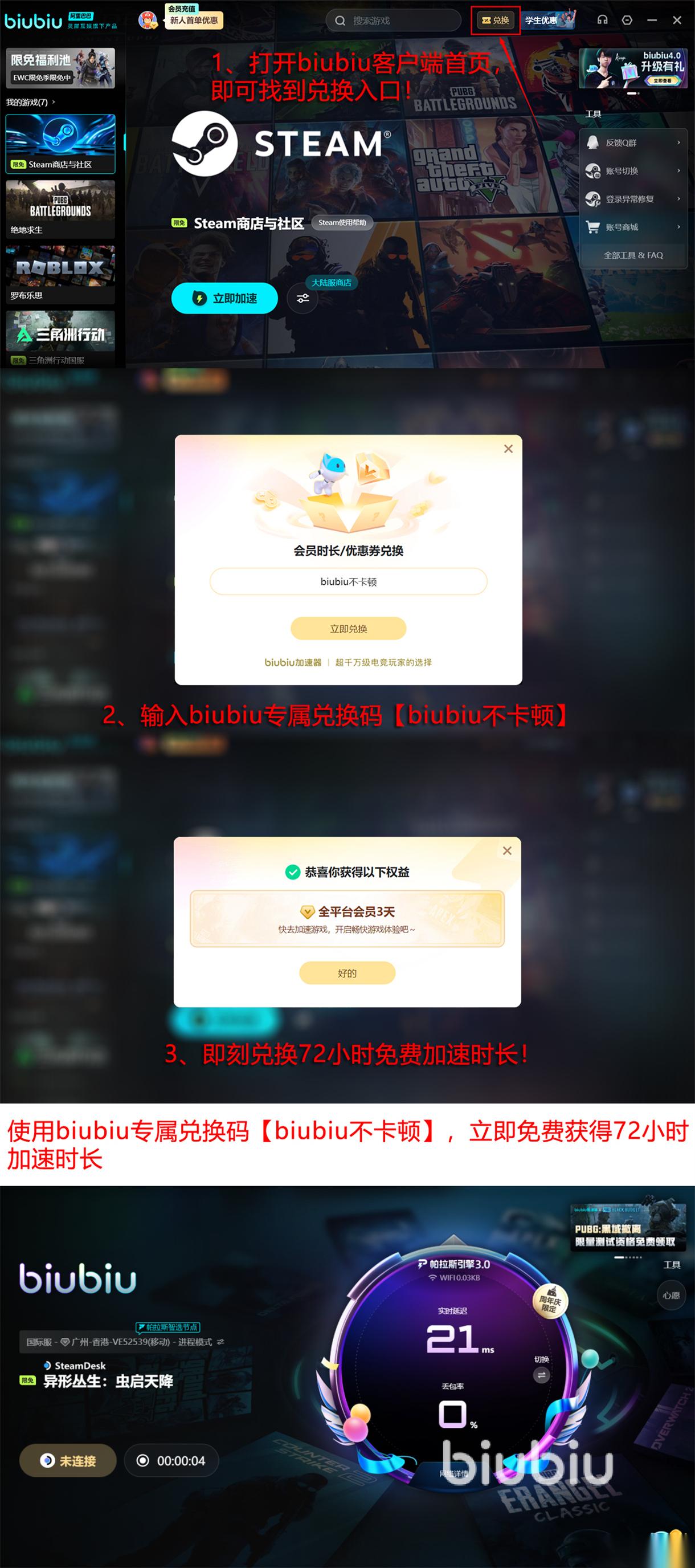 如果现在想要尝试一下biubiu的真实性能,抓紧动手注册一个新账号,新号能免费直接加速24小时,这是biubiu对新人的福利。还有一项福利是每个号都可以用一次的兑换码【biubiu不卡顿】,能兑换到的时间达到了三天。这样两项福利加起来,新号总计96小时的免费加速时长,能够做到真实体验。