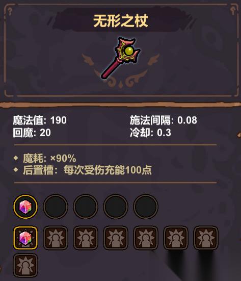 个人认为安全自伤流的核心是两个法杖「末日之兆」和「无形之杖」,一个可以无伤的对自己造成伤害,一个则是受到伤害后进一步进行输出,二者完美组合。又因为两个法杖都是后置槽类型的法杖,再搭配上遗物「充能手环」,所有法杖的后置槽充能效率提升,非常适配。