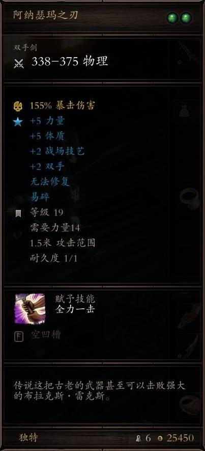 就差那么一点,而且这单手剑还能拿两把,双持完全不虚好吗?虽然阿纳瑟玛之刃还有个孔,但你瞅瞅那“易碎”和“永不磨损”,性价比完爆好吗?