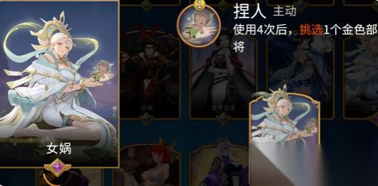 女娲的捏人技能也被称之为理财神器。使用4次就会送金色的部将,星级还会伴随着商店等级去浮动。4个回合,8个回合,12个回合触发,性价比还是比较高的。开局空城,不要盲目去拿卡,如果遇到李秀宁或者是李元芳,那么拿卡才比较合适。就算没有开到高费卡,也可以靠优质卡碰六稳阵,技能可以重复的使用。成型的速度就会超过其他的统帅。