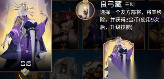 吕后就是一个金币制造机,移除友方部将之后就能赚到三金币。在升级之后卖掉高星卡,收益还可以直接翻倍。前期优先拿上阵招募效果的武将,触发效果之后就需要立刻卖掉。理财的同时还可以保证战斗力。