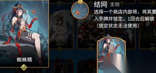 蜘蛛精的结网技能,又被称之为经济类型的福音,一块钱就可以直接锁定优质的部将。仅锁定一个回合的副作用可以完全忽略,前期每个回合可以靠技能拿卡,不需要浪费金币,就可以去购买。卖掉一波之后就能迅速的回本,经济还有战斗力,可谓是双线并行。阵容的适配性也是比较出色的,中期摸到哪个阵营就应该玩哪个,订正之后就可以用金币购买核心上场。技能专门是抓对子理财,升本压力基本上是为0。