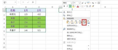2、点击一个目标单元格,右击选择选项框"粘贴复制"中的"格式"。