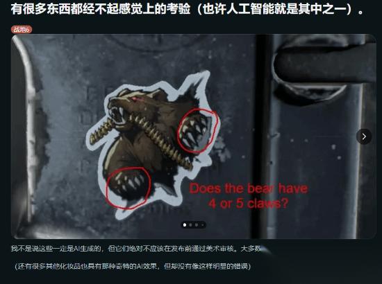 这一发现迅速点燃了社区的“侦查热情”,不少玩家开始主动寻找更多疑似AI生成的证据。有分享了一张新的截图:一只灰熊,一只前爪只有四根爪子,另一只却有五根。他还列举了更多可疑素材,认为《战地6》中确实存在生成式AI内容,而且更严重的是,这些内容似乎未经人工复核就被直接投入到商店中使用。