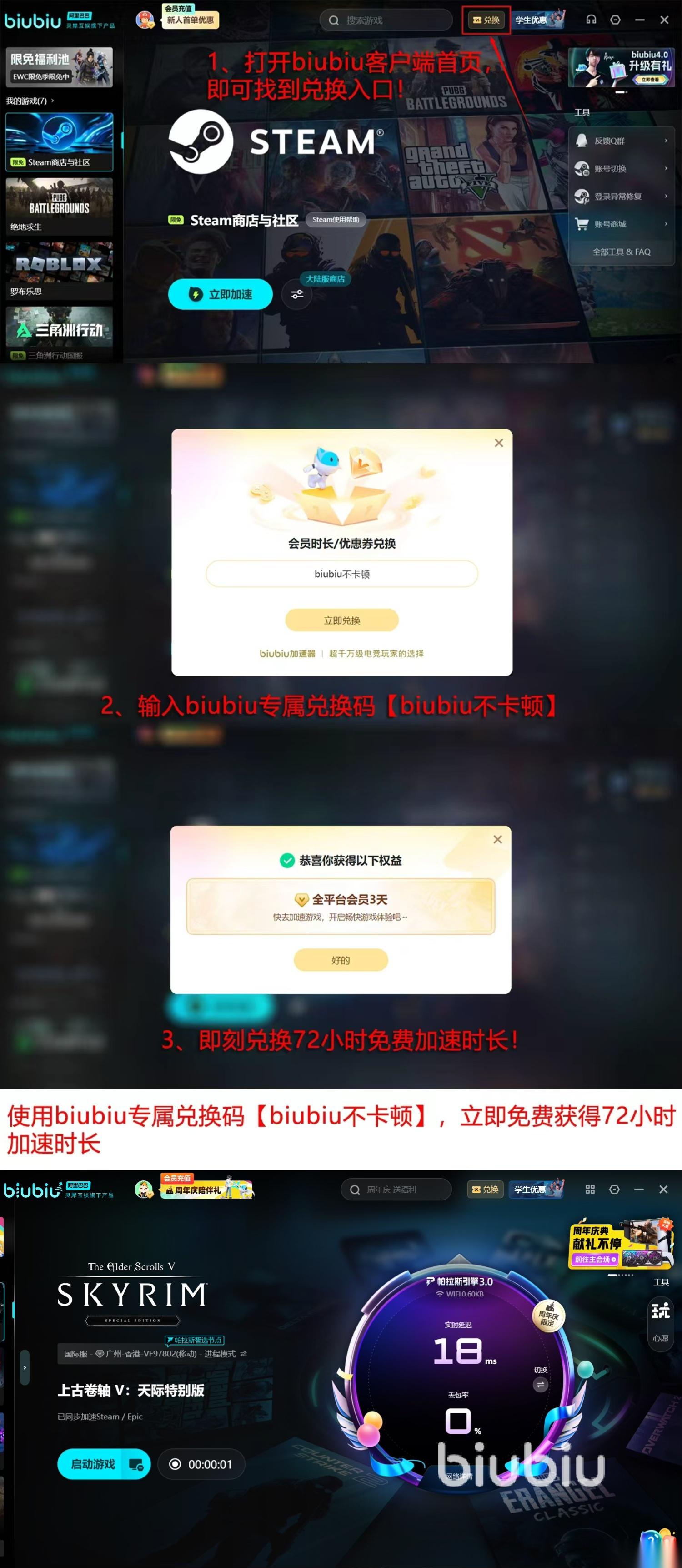 为了让用户能毫无负担地享受加速功能,平台已经为你考虑周全了,首先,官方释放了一批兑换码【biubiu不卡顿】,每一个用户都能用这个码激活3天的加速时长。而且,针对刚完成注册的新用户,平台还直接赠送了24小时的加速时间,让你能尽情地试用。