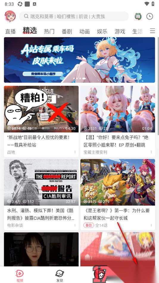 1.当我们进入到AcFun这款软件之后,在打开的页面下方的位置选择我的选项,将其点击打开即可。