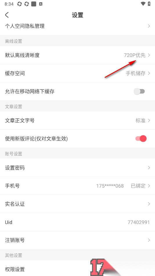 3.再在当前打开的页面上找到其中的【默认离线清晰度】选项,将其点击打开即可进入到页面中。