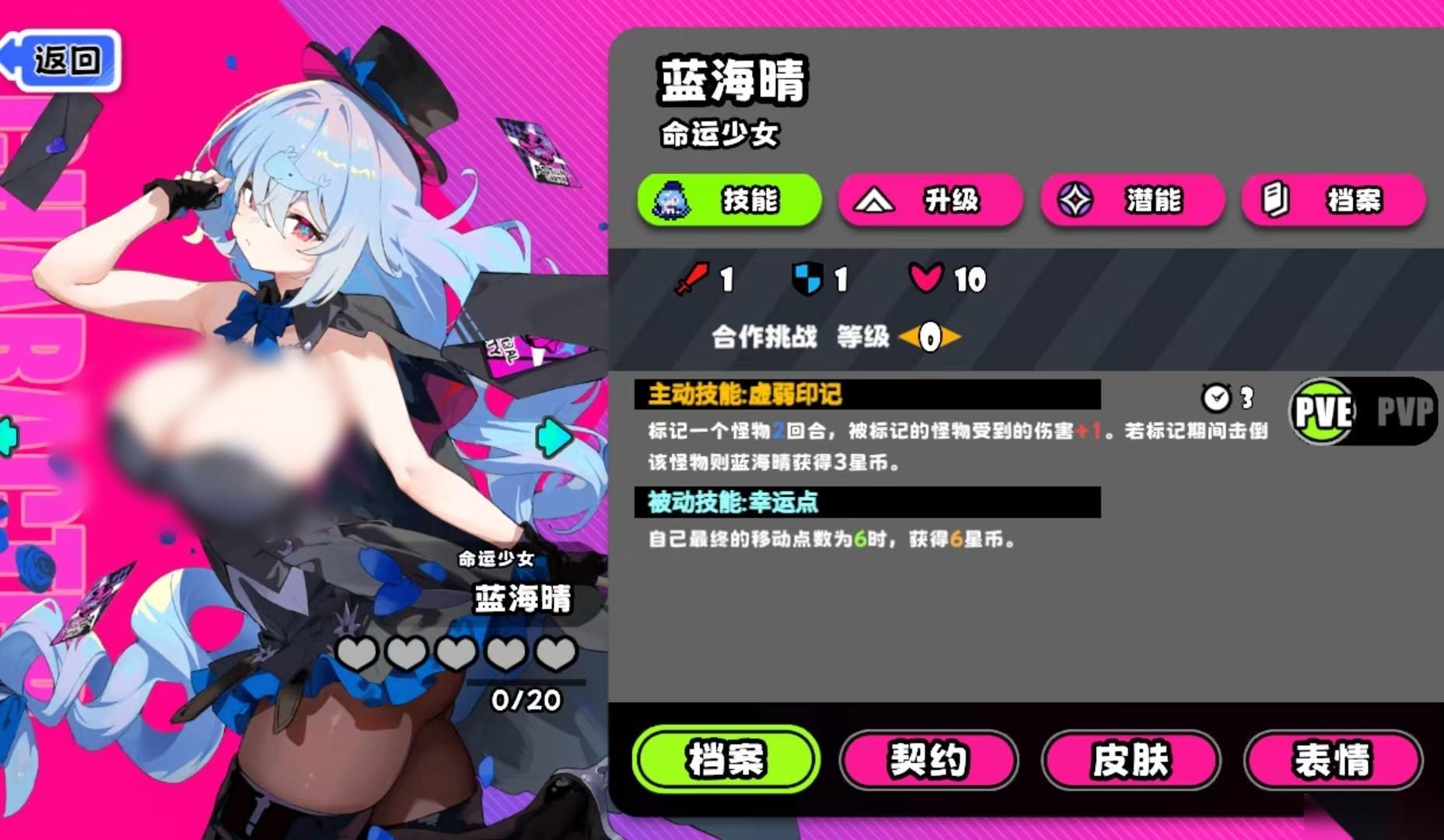 若是选用蓝海晴去参与PVE玩法,她可通过主动技能标记任何一个怪物,此效果可持续2回合,在此期间该怪物受到的伤害会额外加1点,且只要怪物被击倒(不是蓝海晴击倒的也可以),蓝海晴还能通过这一方式来获利3星币。因此,人们可让蓝海晴在第一回合就进行标记,并想办法在两回合内将标记的目标给消灭掉,让蓝海晴在前期能更快地积累资本进行发育。而到了中后期时,可让蓝海晴直接将标记放在boss敌人身上,这样不管谁去攻击它,造成的伤害都能增加1点。
