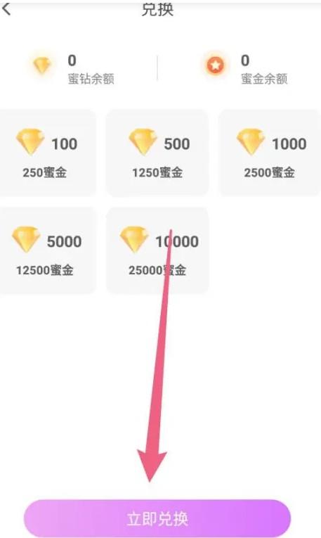 选择蜜金数量点击“立即兑换” ,如下图箭头所示