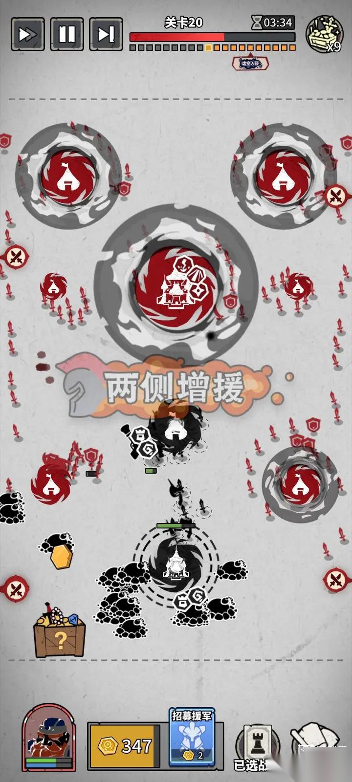 9、图中拿下中路3级兵营,会成为敌方集火点。所以防御中心转移到3级兵营。防御没问题的话就拿下左右两侧的2级兵营。这个关卡,前线兵力消耗比较高,老家我就没升4(感觉升4级消耗兵挺多的)(如果碰到那种只有老家苟到最后的关卡局面,肯定要提前升老家)