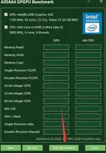 3、在GPGPU测试窗口中,点击下方的“start benchmark”按钮,软件将自动开始检测GPU和CPU的性能。