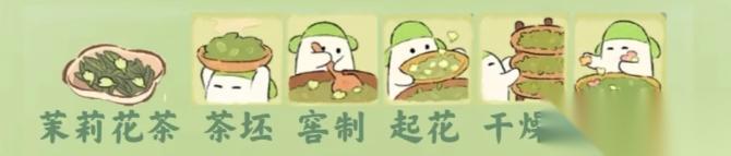 1、茉莉花茶:茶坯、窖制、起花、干燥、提花