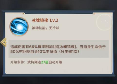 大家使用这个霜龙惯月技能可以更快的累积起来冰魄镇魂需要的状态效果,根据攻击效果来进行判定的话,其实如果当前目标在生命数值低于35%的情况下,给这个敌人还会附加再多一层的冰魄镇魂收益,前期利用第一个技能大概要用三层冰魄镇魂的状态来进行消耗的话,直接用一次这个霜龙惯月就可以将三层全部都累积起来了,当然这里的效果是不受被动额外层数的影响,根据这里的被动效果大家也使用赵云这样的能力时大家也可以注意到,大家也可以快速的将他伤害提升之后,后期能够为他搭配的阵容也是不少的。