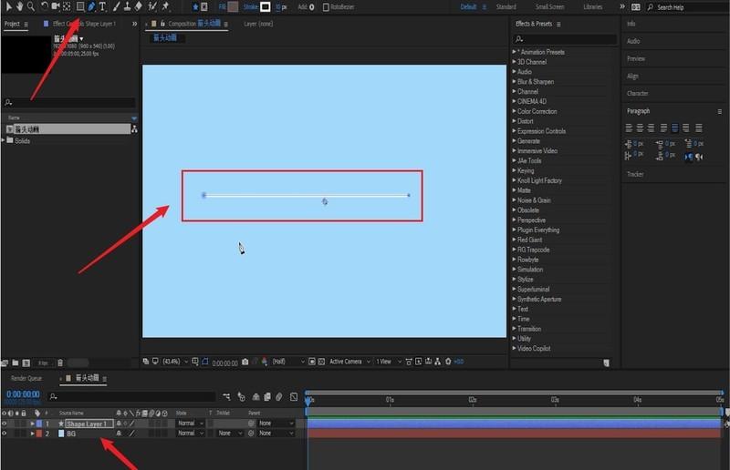 使用钢笔工具,在不选中任何图层的按情况下,在合成中画出一条直线,创建一个新的形状图层,关闭填充,调整描边的大小;(也可以直接新建一个形状图层,然后使用钢笔工具画出一条直线)