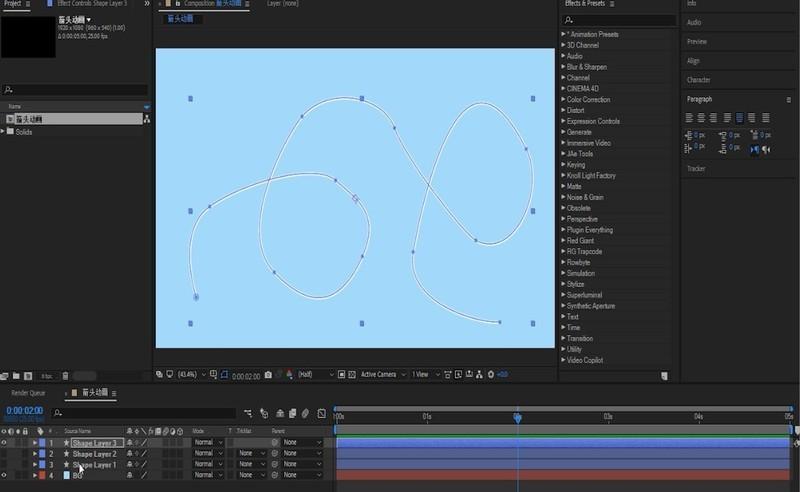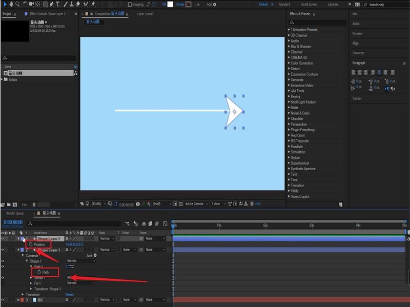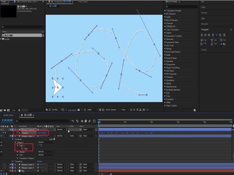 接着我们展开线条形状图层的属性,找到shape-path 1 ,选中path,Ctrl+C复制path,然后展开箭头的位置(P)属性,选中位置属性将复制的path粘贴到箭头的位置属性上;拖动时间滑块就可以看到箭头在变色线条上来回移动了;