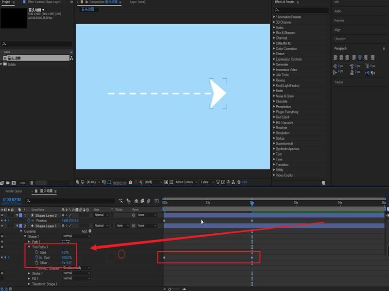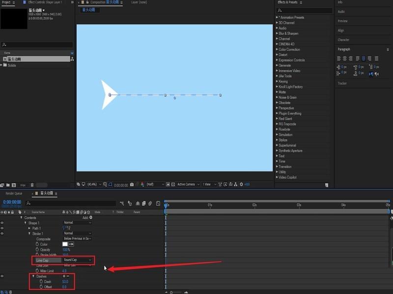 接着我们为线条图层,添加一个虚线效果,并为其添加修建路径动画,这样一个简单的箭头动画就做好了;