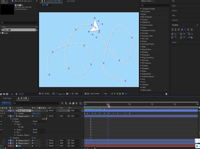 将之前的箭头图层复制一层,将曲线路径path属性,粘贴到复制出来的箭头形状的位置属性上,拖动时间线就可以看到箭头沿着路径移动了,可是箭头的方向不太对;