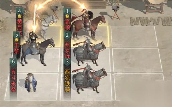 兵种站位:于禁下方放置一名五斗米祭,并在于禁和五斗米祭的前方各放置一名西凉铁骑。