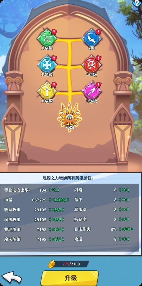 通过升级英雄星能获得“职业石”来升级职业等级,增加英雄属性。职业石可以通过升级SR英雄星能来获取,会容易些。