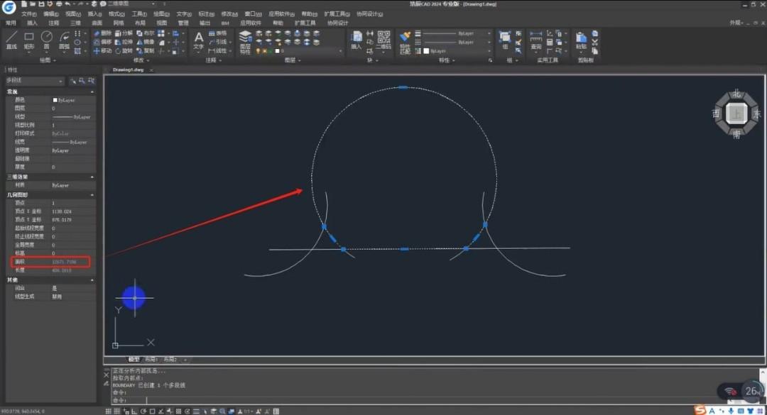 在浩辰CAD命令行输入快捷键【BO】后,点击拾取点,并根据提示拾取图形内任意一点,选中后会有一个封闭的多段线,在特性栏中即可看到该区域的面积。此外也可以使用【LIST】进行计算。