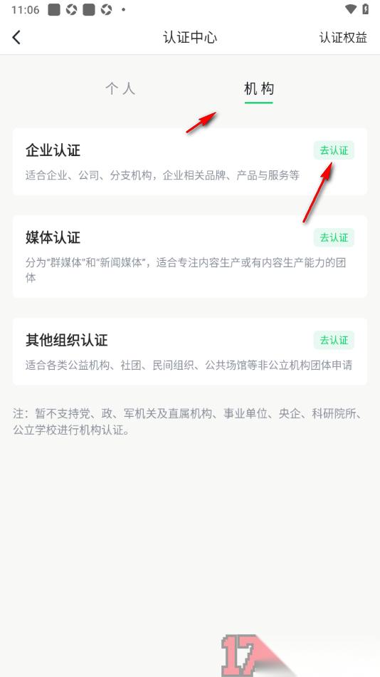 4.这时候在弹出的窗口中就可以查看到显示的相关信息,将顶部的【机构】选项点击打开,选择【企业认证】选项即可。