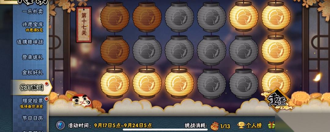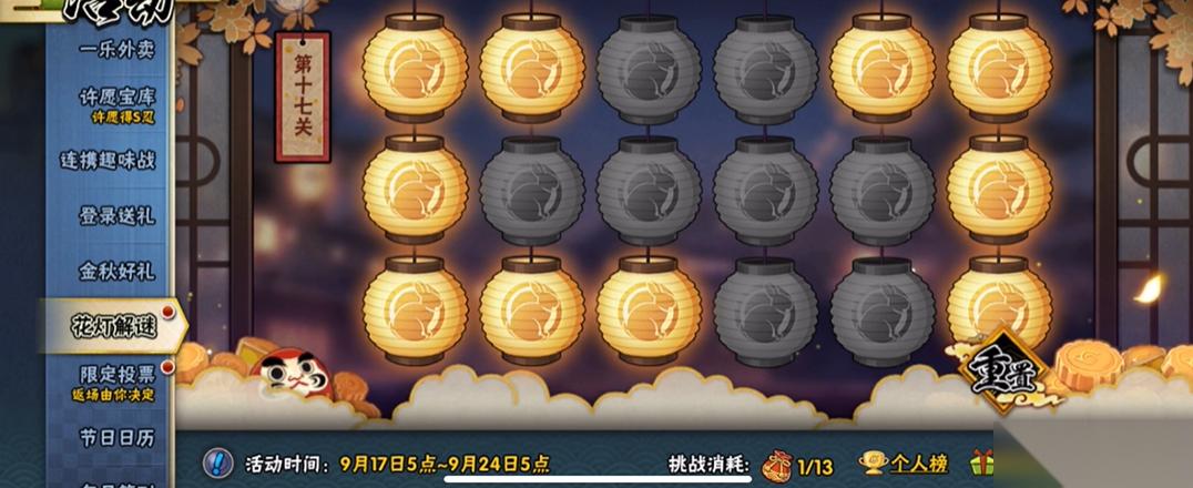 花灯解谜第17关的通关关键在于按照已验证的特定顺序点击三个位置的花灯即可。该关卡的目标是将所有花灯点亮,其核心机制是每次点击一盏花灯,会改变其自身及上下左右相邻花灯的状态。根据多个信息源的确认,只需依次点击最后一行第二个(左二)、最后一行第五个(右二)以及第一行第三个(左三)这三个位置,无论点击顺序最终都能达成点亮全部花灯的目标,操作时需准确识别行列位置,避免误触。