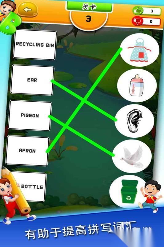 对于儿童来说,想要学习英语,《英文连连看》能让孩子的英语知识得到提高,充满着各种挑战,乐趣也是很不错的。不同的英语单词能让孩子增加自己的词汇量,游戏的机制也是很简单明了的。当中还可以巧妙地利用图像,让孩子们在欢乐当中就能够学习到更多的英语知识,玩家需要将单词的含义和对应的图片连接之后,就代表已经通关了。