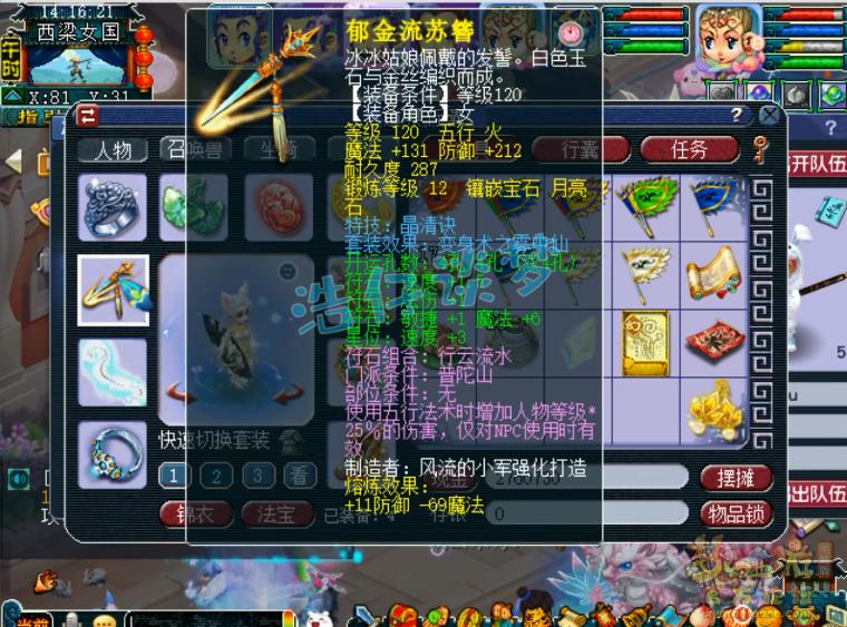 120级晶清诀雾中仙套女头,打了12锻月亮石。