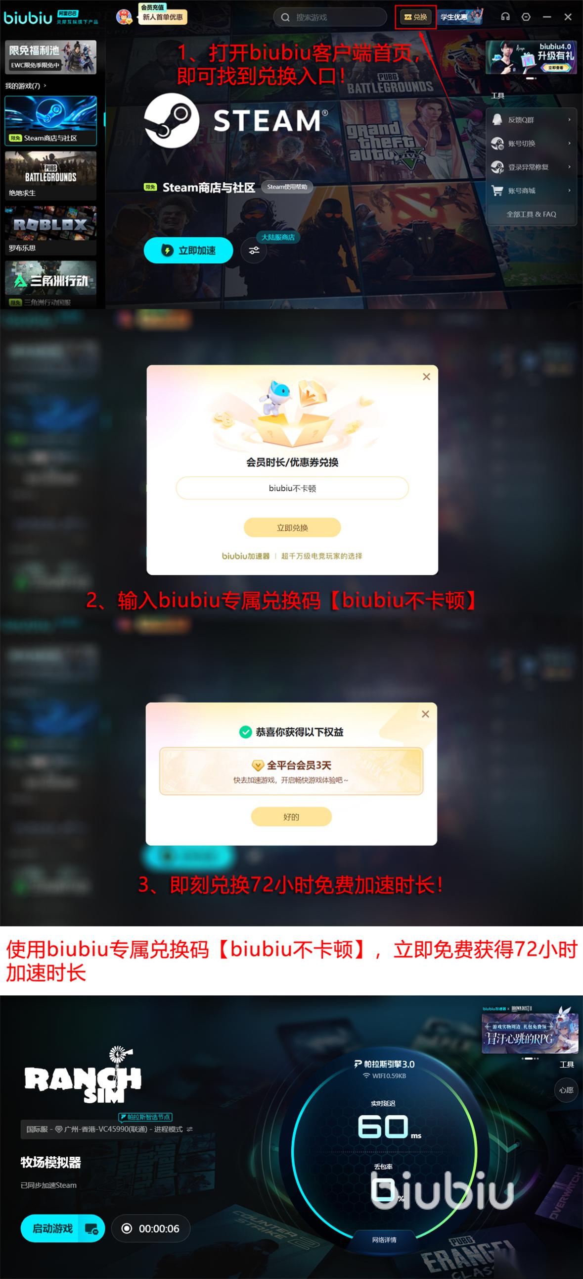 不用担心biubiu的性能是否能够满足自身的要求,因为注册一个新号直接就能免费加速24小时,这样先来尝试一下具体的效果。biubiu还推出了一个兑换码【biubiu不卡顿】可以兑换三天加速时长。这样新号两项福利加起来就是96小时的免费加速时间非常丰厚,另外兑换码每个号都能用,之前老号也可以再次回归。后续在进行充值续费的时候,还有首次充值折扣以及可以通过各种活动获得代金券,这样都能真正的减少负担。