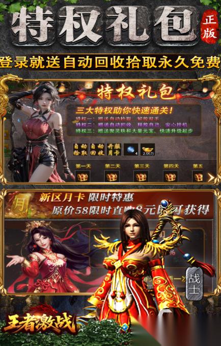 三职业高爆率传奇爱好者都可以试试王者激战,这是款拥有很多福利和高爆几率的免费传奇神作,可以自定义充值月卡每天都可局的各种奖励,任务系统多样带来的战斗快感也不错,多职业可以互相转职的设定也是点睛之笔,无需氪金也可在个人boss副本里获得形形色色的装备,激战不断的跨服PK体验更为爽快。