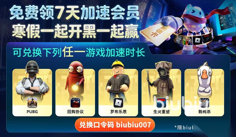 优质加速服务应以高效便捷为目标,biubiu加速器具备跨平台一键接入功能,支持Steam、PlayStation、Xbox、Switch等主流游戏平台,其摒弃繁杂的参数配置步骤,用户只需敲入“罗布乐思”再按下启动按钮即可自动匹配最佳服务器节点,从而将操作化为最简。网络延迟作为影响在线互动体验的重要因素之一,对于竞技表现有着明显的制约作用,所以专业辅助工具显得尤为重要,这款产品采用全新帕拉斯引擎3.0版本,经过迭代升级智能链路算法从而不断优化性能,著名PUBG冠军选手左梓轩全程参与调试工作,普通玩家也能享受到接近职业级的稳定低延迟能力。目前正处于限时优惠期,2月10日-3月9日,输入专属代码【biubiu007】即可解锁“PUBG、回购协议(R.E.P.O.)、罗布乐思、生灵重塑、鹅鸭杀”5款游戏中任意一款共七天免费加速特权。