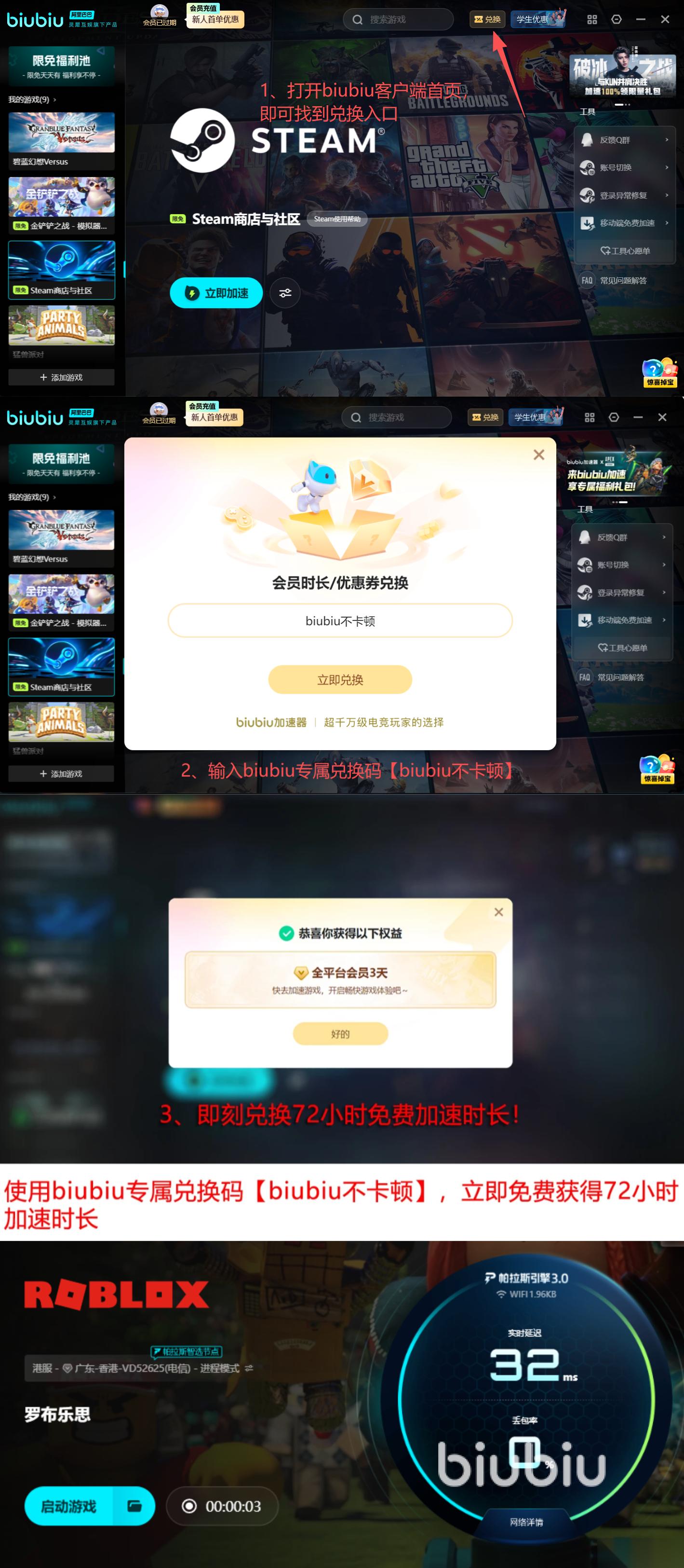 biubiu加速器对新用户推出专属优惠活动,完成注册后即可享受24小时全平台无门槛加速服务。若输入口令【biubiu不卡顿】,则可额外获得72小时优质加速权益,累计时长可达96小时的高品质全平台游戏加速。需要注意的是,【biubiu007】与【biubiu不卡顿】两个口令仅可选择其一兑换相应福利内容。