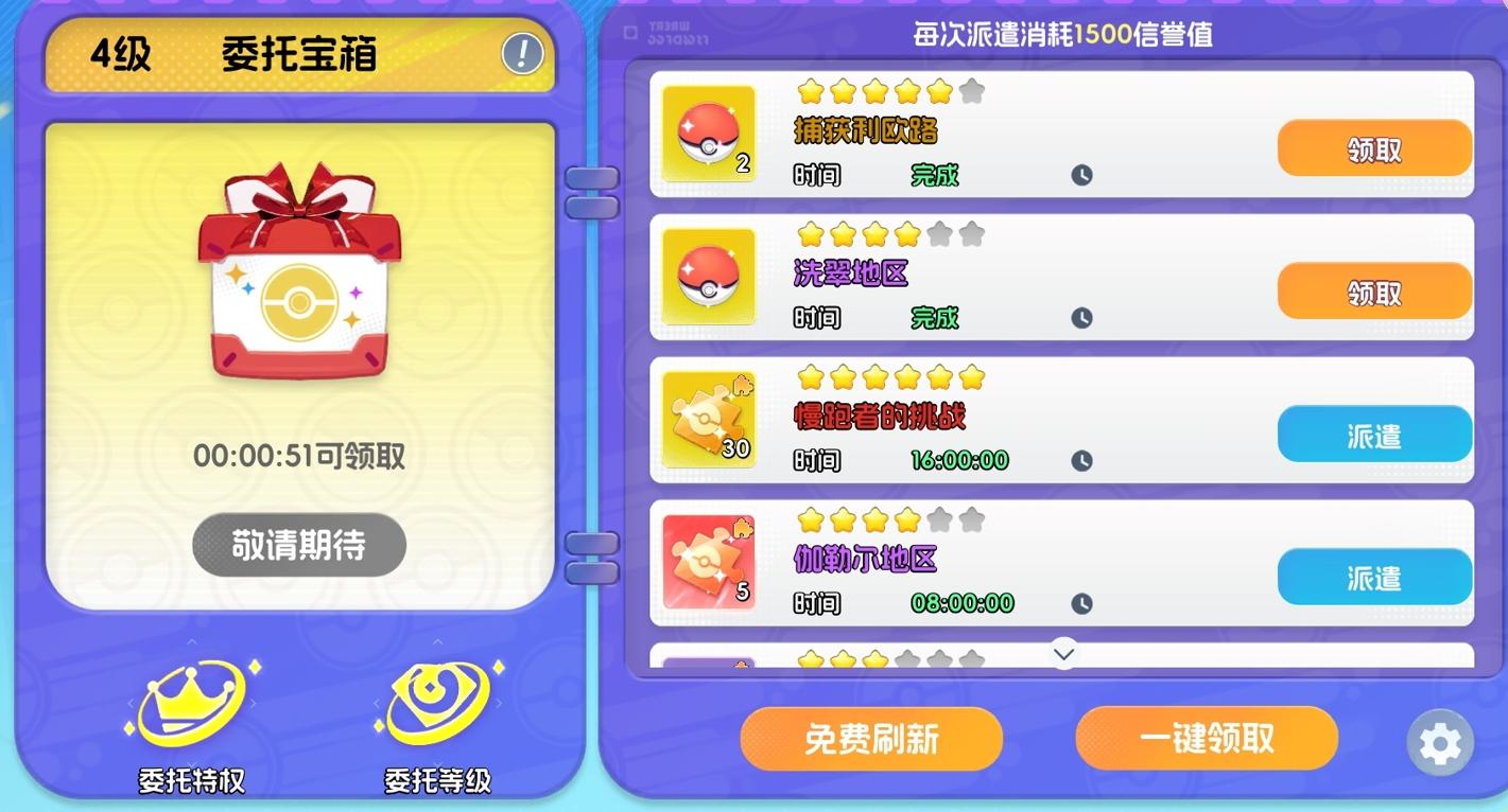 这些派遣任务完成起来也很简单,人们接取想要完成的任务后,只需选择合适的宝可梦,便可派遣它去执行任务,等时间到后就能领取任务的奖励。每次派遣都需要消耗1500的信誉值,信誉值不足时无法接取任何派遣任务,玩家们可通过多种方法来进行信誉值的获取,无论是推图还是领取挂机资源都能拿到,产出途径很多且产量非常大,所以不用担心出现信誉值不足的问题。