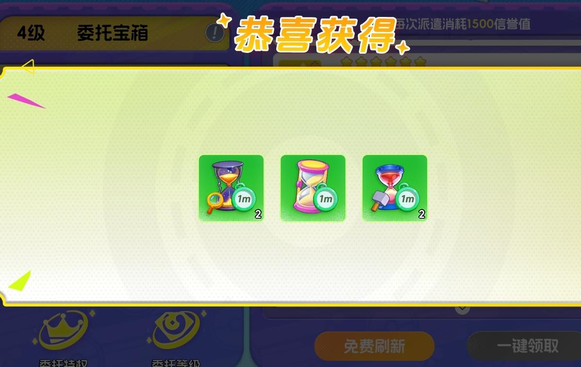 完成派遣任务后,玩家们可一键领取所有派遣任务的奖励,并且还能提升自己的委托等级,令自己能获得更丰厚的委托宝箱。委托宝箱是委托板为玩家们送来的福利功能,每次领取都能得到数量不等的加速道具,可用于加速建筑物的升级、研究加速等,且委托等级越高,委托宝箱里所能开出的加速道具也会越多。委托宝箱每天能领取无数次,但每次领取后,下一个宝箱的生成时间会比前一个宝箱更久,每日零点会进行重置。