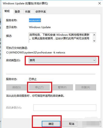 2、双击打开“Windows Update”服务,将其启动类型修改为“禁用”,然后点击“停止”,最后点击应用并确定,如下图所示。