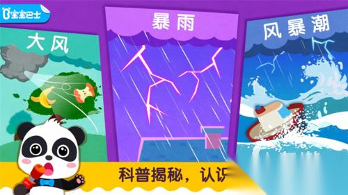 《宝宝台风天气》带孩子进入更具有挑战性的气象世界。这里的台风不是小雨,而是气势磅礴的风暴,孩子们会在一个安全的环境中学习台风的形成和影响,游戏中使用了各种卡通人物来教给孩子台风的危害以及怎样保护自己。通过游戏内动画、小故事来表现台风的强大威力,并且教给小朋友遇到突发状况时应该怎样做。