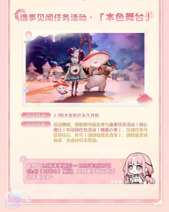 活动期间,搭配师可前往参与逸事任务活动「初心漫行」和见闻任务活动「糖霜心事」,完成任务可获得钻石、称号【团团糯糯美食家】、团圆蜜果球食谱、养成材料等奖励。