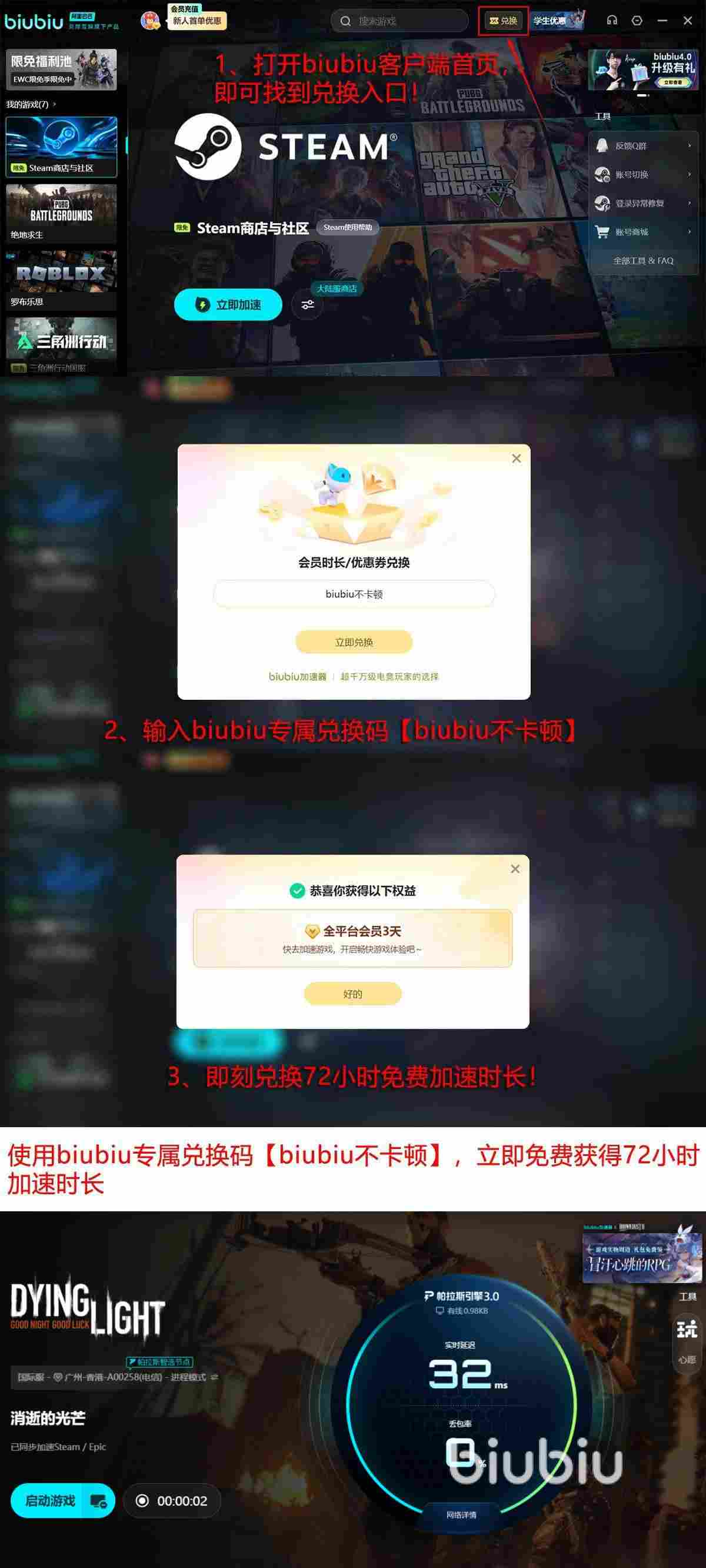 除了拥有非常不错的加速效果外,还拥有非常不错的福利活动和海量游戏库,其中福利活动拥有使用【biubiu不卡顿】兑换码兑换三天使用时长新用户注册免费获取24小时使用时间这两种,加一起就是说可以白嫖96小时的使用时长,海量游戏库指的则是加速器对市面上能看到的所有的热门游戏进行了收录,并且给到了多区服节点的选择从而让用户不管是玩什么游戏,有加速需求的话都可以在上面找到并且进行加速,也正因为拥有这些优点才会说是综合性能第一的加速器。