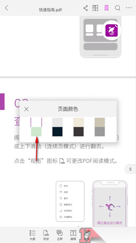 有的用户在操作福昕PDF编辑器app这款软件的过程中想要将PDF文档的页面颜色设置成其他颜色来显示,那么就需要打开阅读设置窗口找到页面颜色功能即可更改,可以将颜色更改为浅绿色,有一定的护眼效果,也可以更改为黑色颜色,对于经常在夜间编辑PDF文档的用户来说是比较友好的。