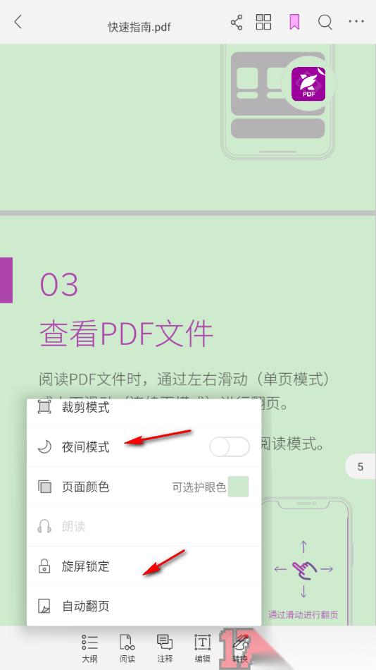 5.那么用户长时间操作该文档时也不会觉得眼睛酸痛的情况,除此之外还支持设置夜间模式、自动翻页等内容。