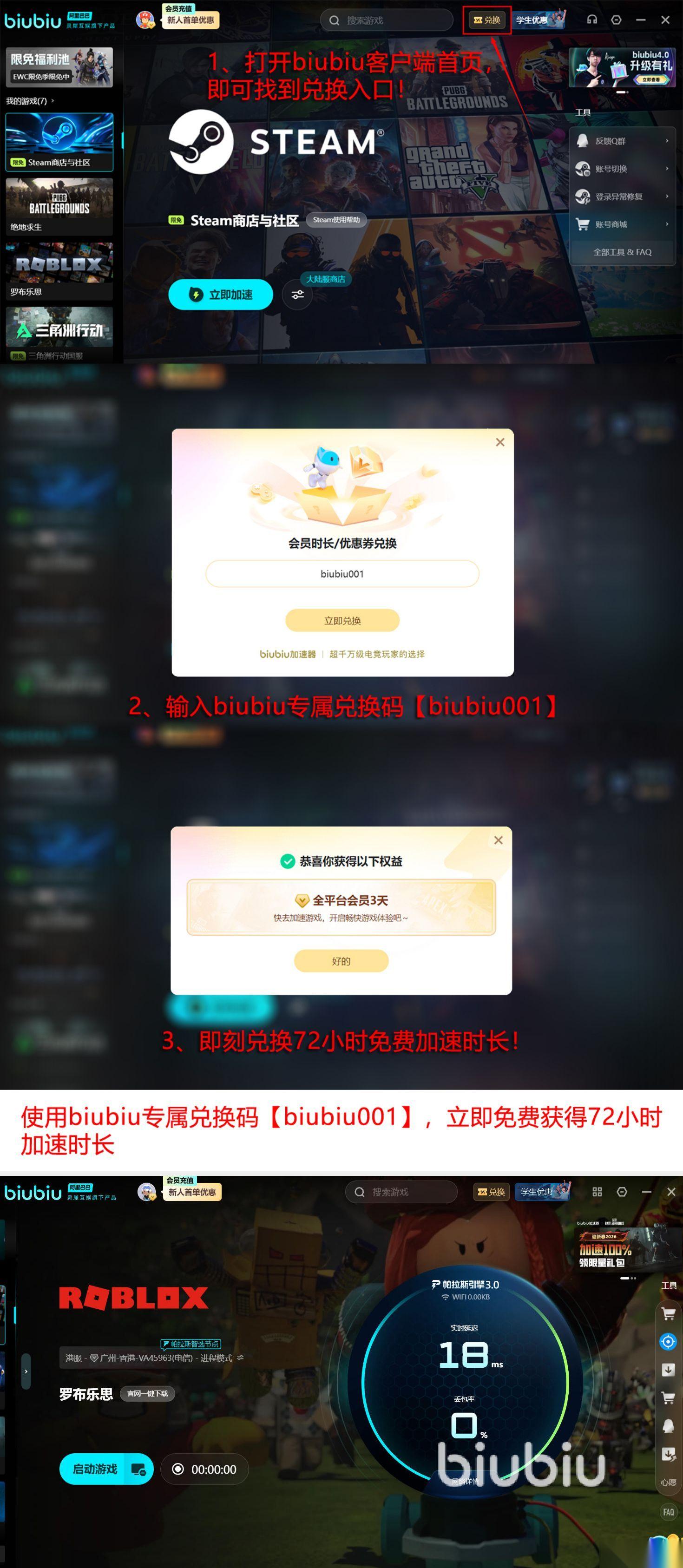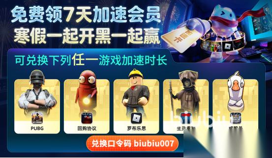 在设计的过程当中,更注重的就是所有人群的权益,因此也推出很多福利,让大家免费体验,如今推出了一种全新的福利,就是新用户凭借【biubiu007】兑换码也能为大家换取7天的免费加速特权,不过是有要求的,活动时间2月10日-3月9日,在体验指定的5款游戏任选其1,可享受其中有罗布乐思或者是鹅鸭杀等等。