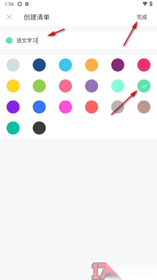 2.在打开的创建清单窗口中,输入自己想要创建的清单名字和颜色,然后点击右上角的【完成】按钮即可。