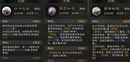 典韦主动携带【历战之躯】、被动【一夫当关】,提高前排坦度、控制敌方攻击方向。小乔的主动、被动技能都带【厉兵秣马】,给自身和追击格单位提供护盾和伤害减免,使穿杨军可以输出。袁绍推荐携带【深仁厚泽】,回血的同时可以提高自身的统率属性,分担敌方的输出,使用【一夫当关】增加防御。各个特色明显的技巧组合起来就是一套完整的战术系统,保证了队伍一直处在稳定高效的运转之中。