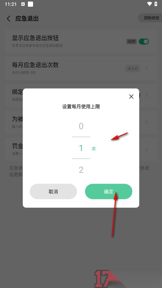 4.在打开的窗口中用户可以根据自己的需求来设置每月应急退出的次数,之后点击【确定】按钮即可保存。